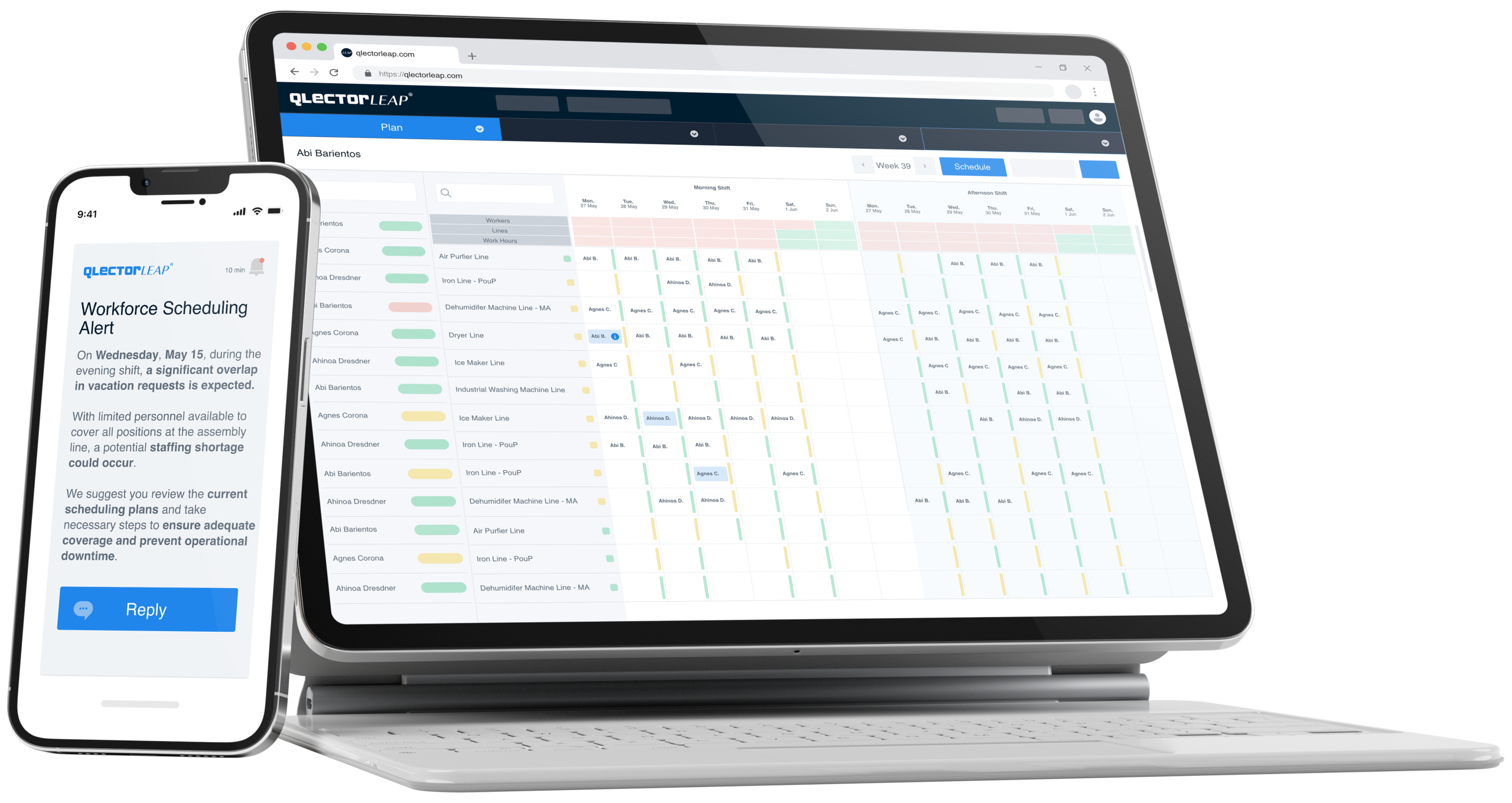 AI-powered workforce scheduling solution that aligns people with production plans, real-time demands, and their availability, skills, certifications, and limitations, ensuring the right person is always in the right place at the right time.